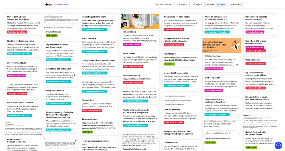 For example, for the bucket “Posts about services,” I can create five posts answering questions clients asked in discovery calls. And for the bucket “For freelancers”, I can chunk down the topic of feedback into four separate posts and create them in a single sitting.